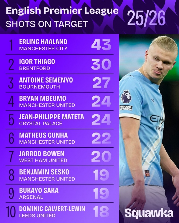 开云APP下载-本赛季英超射正榜:哈兰德居首,塞梅尼奥、萨卡+曼联三叉戟在列