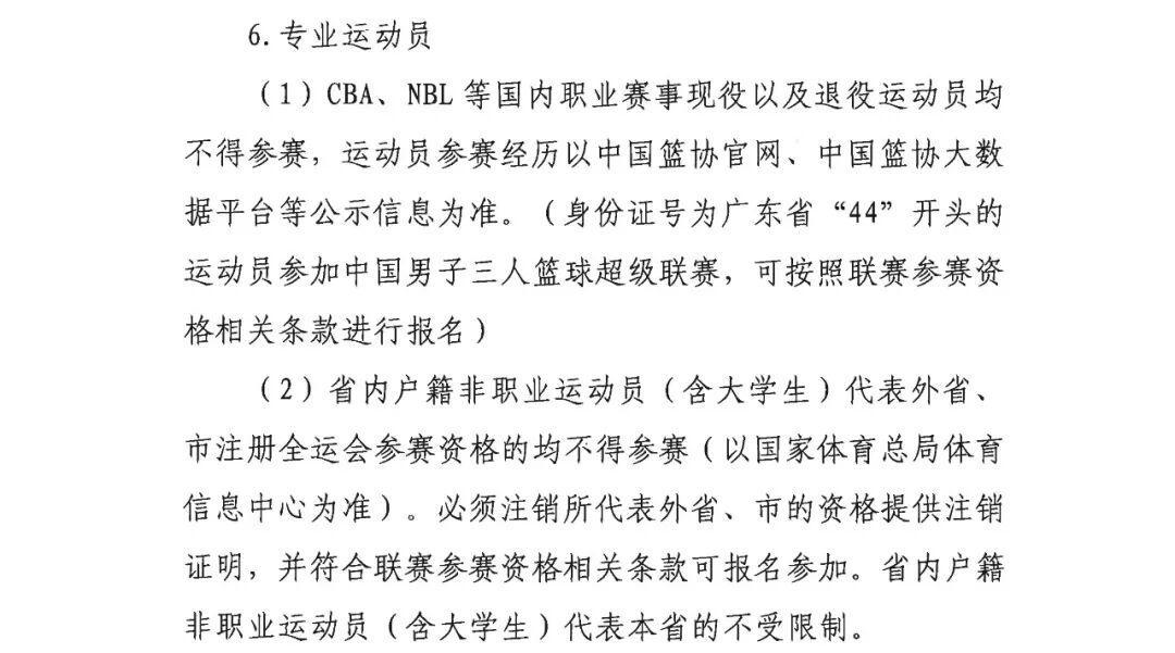 (1) CBA、NBL等国内职业赛事现役以及退役运动员均不得参赛,运动员参赛经历以中国篮协官网、中国篮协大数据平台等公示信息为准。(身份证号为广东省"44"开头的运动员参加中国男子三人篮球超级联赛,可按照联赛参赛资格相关条款进行报名)